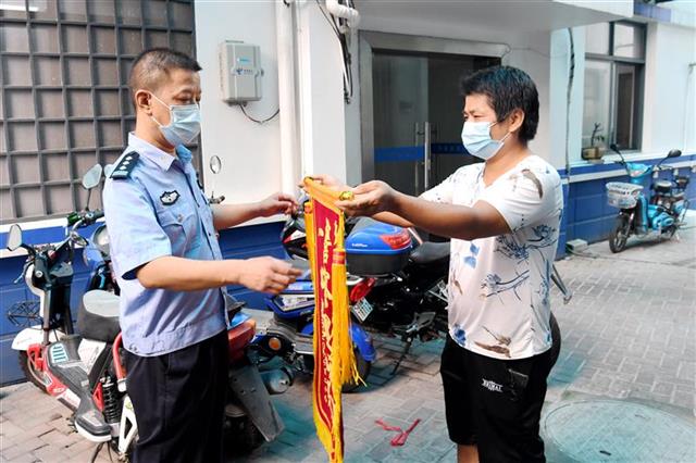 “真没想到我的车会失而复得!多亏了你们!”7月29日上午,在江岸区公安分局丹水池派出所院内电动车发还现场,失主在领回被盗的电动车后,将一面写有“警察显神威 一心为人民”的锦旗送给办案民警黄海。