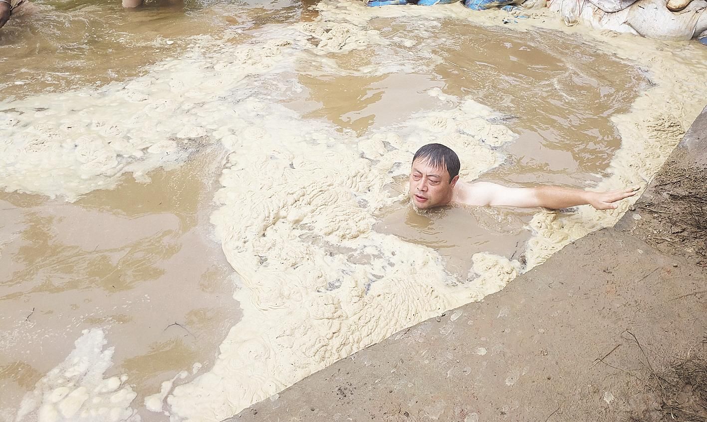 他跳入浑水中,用身体测量出水点,渠底有沙子,他深吸一口气钻入水中,用手摸探出沙的厚度。通过三次潜水,他钻出水面摸了一把脸说:“出沙量约1米厚,出水处为渠道侧壁1.2米处!”