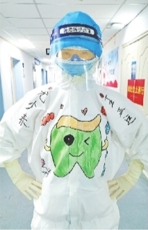 王亚运在防护服上画上卡通牙齿为病人加油打气。