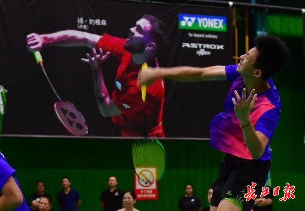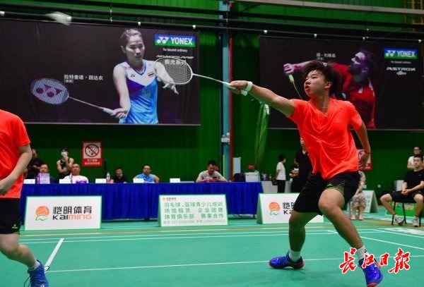 一位双打队员在后场大力扣杀,精彩的瞬间动作与国际羽坛名将的照片同款。