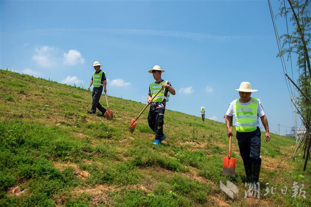 8月1日,武汉市江岸区朱家河堤岸,防汛人员头顶烈日,巡堤查险。连日来,武汉江河水位持续回落,但经过多天洪水浸泡的堤坝,土质松软,容易出现险情。防汛人员不敢掉以轻心,在高温天气下坚守岗位,排险巡查,确保安全。(湖北日报全媒记者 蔡俊 摄)