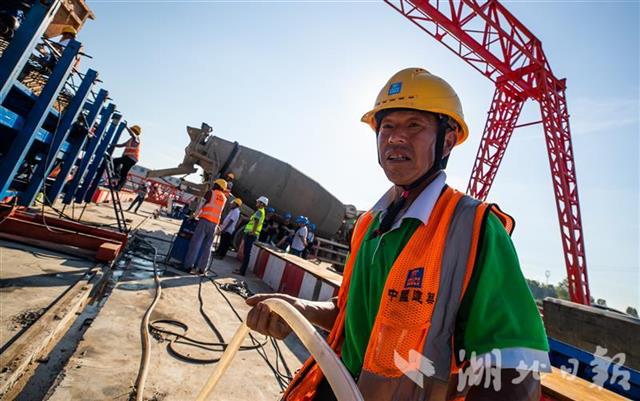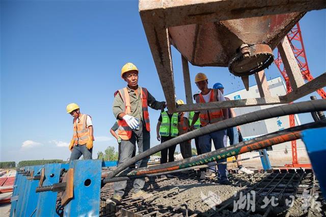 8月1日,在位于鄂州的武阳高速项目中建三局1号制梁厂,工人冒着高温在浇筑预制箱梁。当天,由中建三局承建的武阳高速第二标段鄂州段第一榀箱梁浇筑成功,标志着该制梁厂正式投产,为项目大面积制梁施工奠定了坚实基础。中建三局承建的武阳高速项目全长10.544公里,共需4044榀预制箱梁,1号制梁厂预计每月可生产小箱梁200榀以上。武阳高速起于武汉光谷,经鄂州、黄石,向东对接南昌,是《长江中游城市群发展规划》中连接武汉、南昌的重要通道。(湖北日报全媒记者 柯皓 通讯员 杨波 摄)
