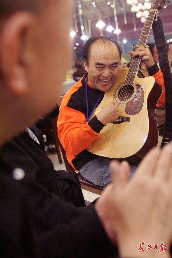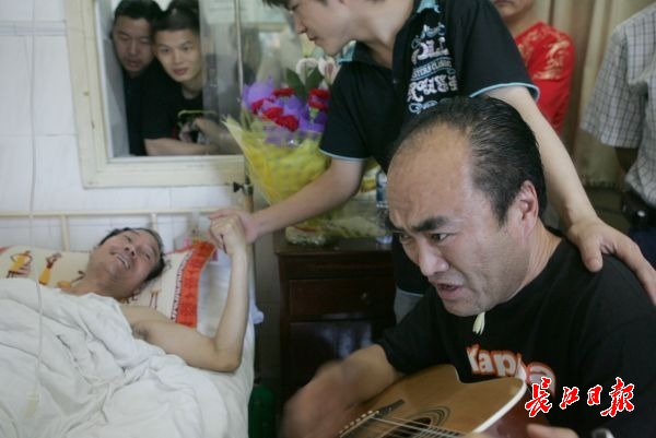 2007年6月3日,在湖北省肿瘤医院,吕文礼先生带领吉庆街的一群艺人为重病中的另一位“四大天王”“拉兹”(一个月后去世)演奏吉他音乐,鼓励他战胜病魔。记者金思柳 摄
