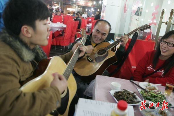 2007年11月2日,吕文礼先生和他的儿子(左一)一起在吉庆街为食客表演吉他弹唱。记者金思柳 摄