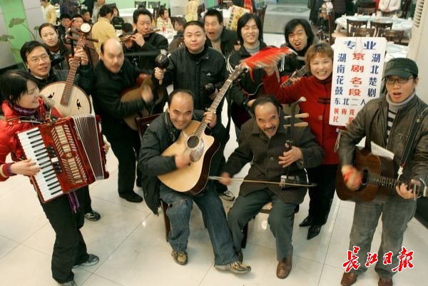 在吉庆街有“二胡皇后”之称的吴晓红,比“老通城”早一年来到吉庆街当表演艺人。“在这么多艺人中,我和‘老通城’关系是最好的。”吴晓红说,20年前,第一次见“老通城”在吉庆街表演,“他带个小录音机别在身上,带着扩音器边表演边唱,很有感染力。”后来“老通城”开始吉他弹唱,“他是河南豫剧团出来的,有专业水平,乐感特别强,能自编自唱、自导自演,喝点酒之后还能即兴创作,现场气氛特别好。”