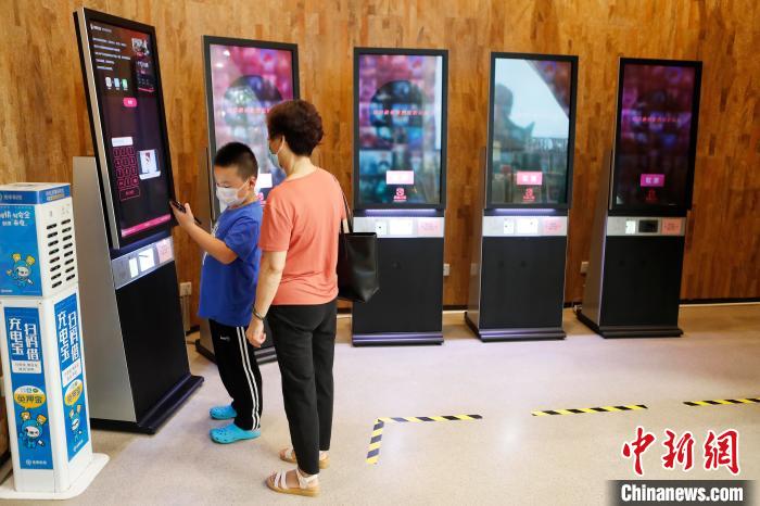 观众正在电影院自动取票机前取票。 殷立勤 摄