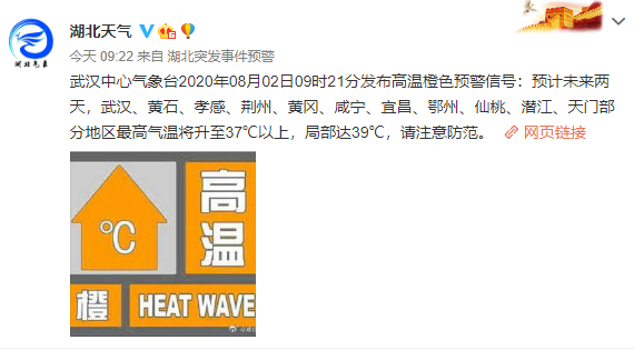 武汉中心气象台2020年08月02日09时21分发布高温橙色预警信号:预计未来两天,武汉、黄石、孝感、荆州、黄冈、咸宁、宜昌、鄂州、仙桃、潜江、天门部分地区最高气温将升至37℃以上,局部达39℃,请注意防范。