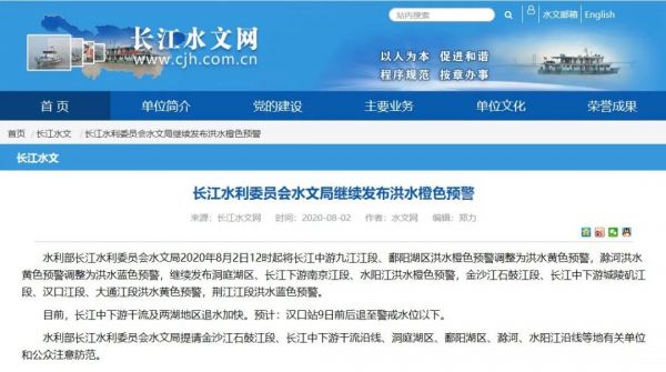 水利部长江水利委员会水文局2020年8月2日12时起将长江中游九江江段、鄱阳湖区洪水橙色预警调整为洪水黄色预警,滁河洪水黄色预警调整为洪水蓝色预警,继续发布洞庭湖区、长江下游南京江段、水阳江洪水橙色预警,金沙江石鼓江段、长江中下游城陵矶江段、汉口江段、大通江段洪水黄色预警,荆江江段洪水蓝色预警。