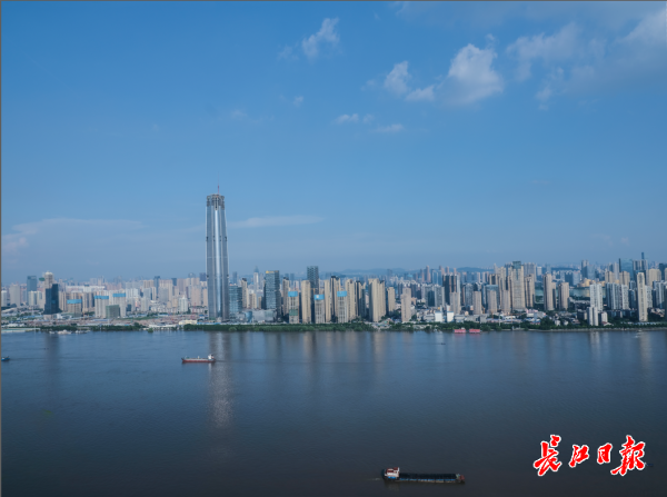 长江日报-长江网8月2日讯(记者雷衎 通讯员刘虹)2日一大清早,两江四岸的天空湛蓝如洗,白云飘飘。俯瞰长江,碧波荡漾,水天一色,犹如一幅巨型画卷铺陈开来。