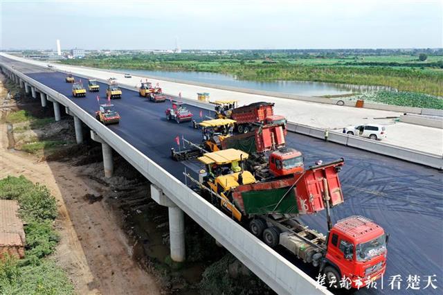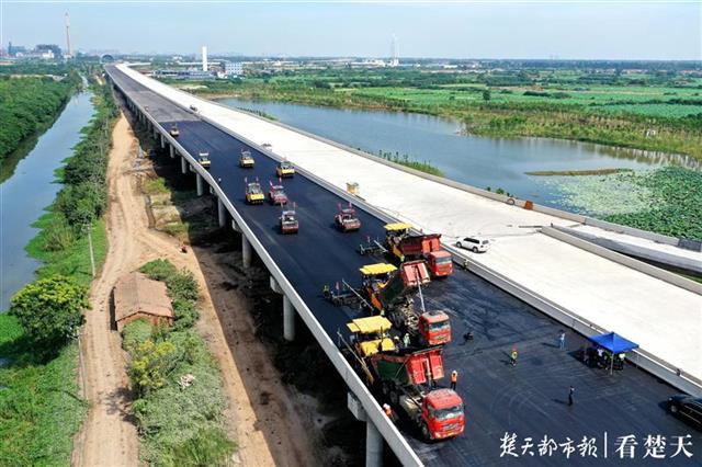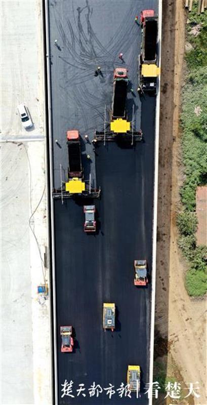 8月2日,武汉东四环线施工现场,包括3台大型摊铺机在内的14台专业设备正在桥面进行沥青摊铺作业。180℃的滚烫沥青从摊铺机上缓缓铺上路面。