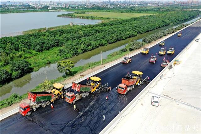 据悉,本次沥青摊铺从北湖互通至青山长江大桥,总摊铺长度为8.18公里。目前,参建单位抢抓雨后连续多日晴好天气,全力奋战,冲刺东四环线今年12月全面建成贯通。