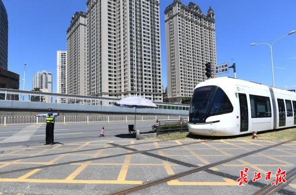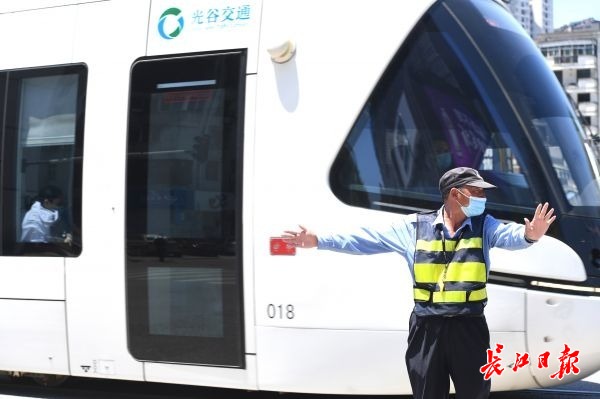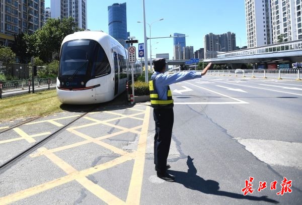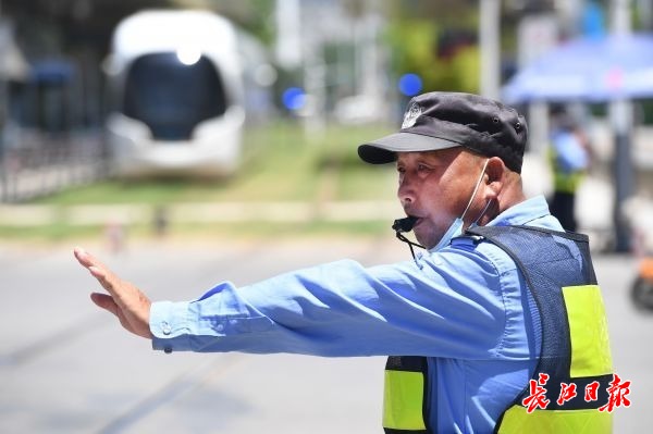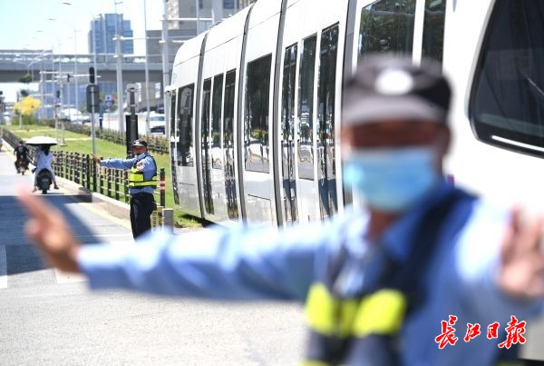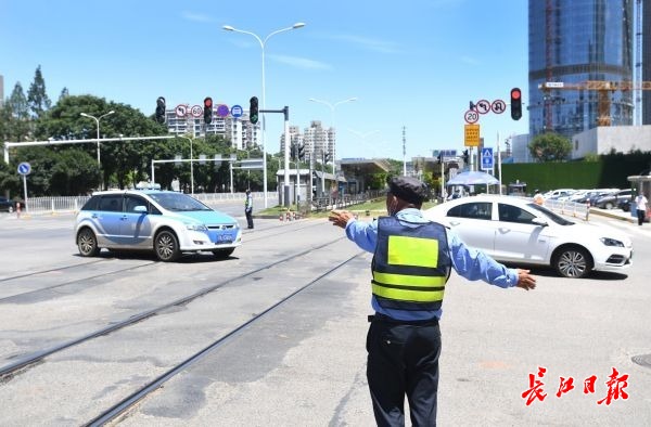 长江网8月3日讯 8月3日,东湖高新区关山大道上,轨道交通安全员顶着炎炎烈日坚守每个道口,每当有轨电车经过时,他们吹着口哨打着手势引导交通安全。