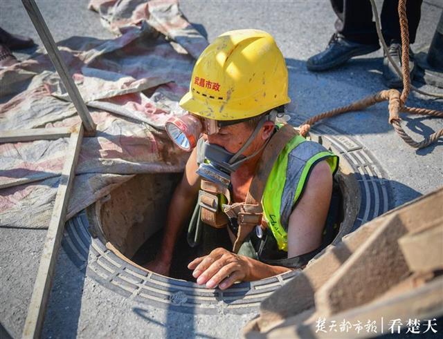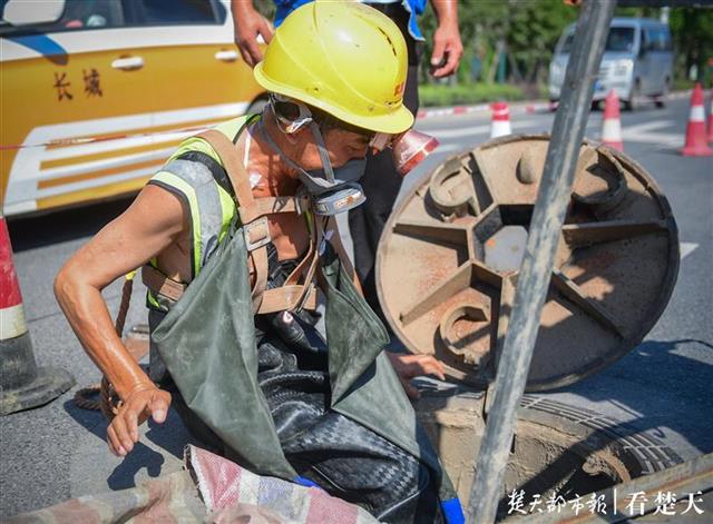 8月3日下午,骄阳似火,酷暑难挡,武昌秦园路靠近临江大道附近,10余名工人师傅全副武装,对此处的地下管道进行清淤疏捞。