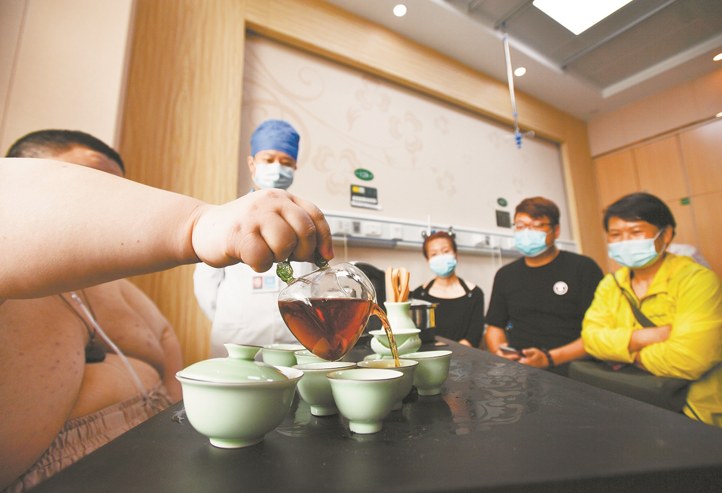 该院肥胖症与代谢病外科中心治疗过的“胖友”们,还专程相约来病房探望他,给他加油,鼓励他配合医生治疗。看到大家的成功先例,周先生心情很好,还在自己的小茶桌上为各位“胖友”泡茶。