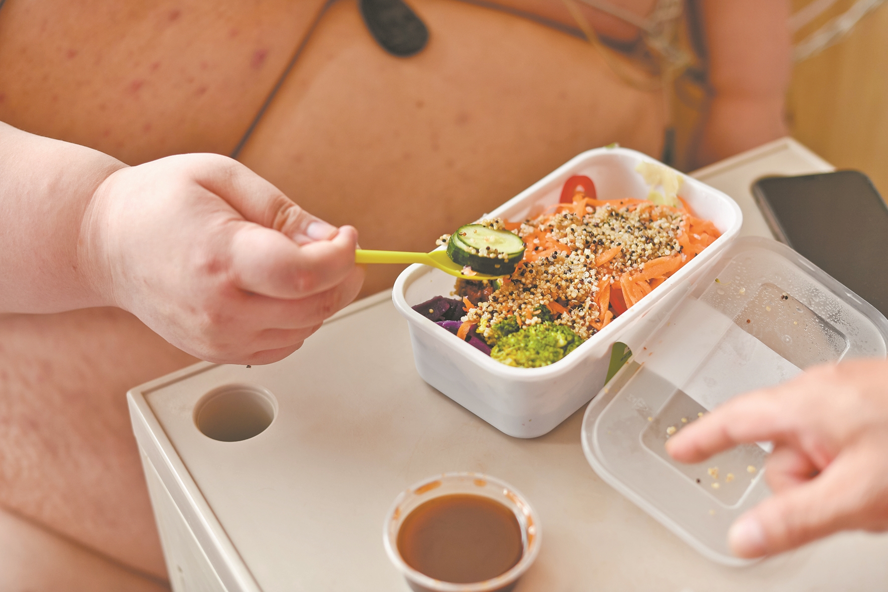 医院骨科康复科为周先生进行了近两个月的站立训练、呼吸训练、上下肢训练等,帮他增强肢体肌肉力量和减脂,并改善心肺功能;医院内分泌科副主任代喆为他制定减重营养餐,严格控制饮食,并通过减重针等内科手段,起到了明显的减重效果。