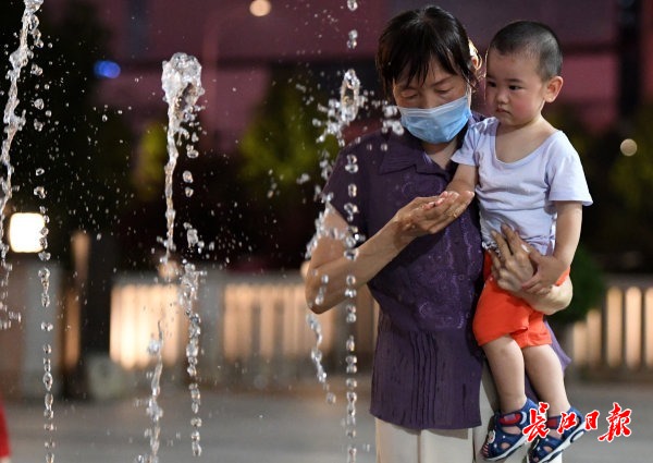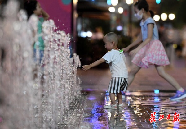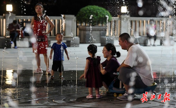 长江网8月4日讯一年之中,热在三伏。8月3日晚,武昌汉街的广场喷泉变得热闹起来,很多市民带着孩子来到这里消暑纳凉。 (记者李子云 摄影报道)