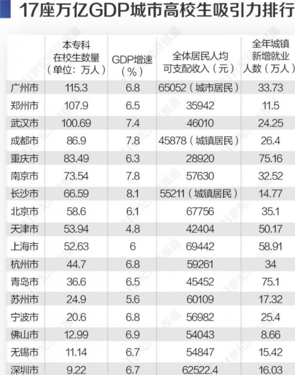 在城市高校毕业生吸引力排行榜上,武汉位列广州、郑州之后,排名第三。长江网记者梳理发现,排名前三位的城市在校本专科生数量均突破百万。从就业指数而言,去年武汉市全年新增就业人数超过24万,排名位居前列,而武汉人均可支配收入为4.6万元,北上广深杭则全部突破或接近6万元,不过与重庆、郑州、青岛等上榜城市相比,武汉仍处于领先。