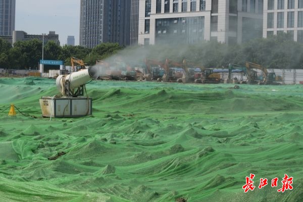 “这里位于发展大道与后襄河一路交会处,工地旁边就是二环线,车流、人流密集,因此特别注意工地扬尘管理。”施工方中建三局三公司项目负责人吕为仓说,现场土方采取分层分块开挖,未施工区域一定用绿网全覆盖,在土方开挖和桩基施工时,一旦当天作业完毕,立刻将裸土覆盖。“我们买的绿网是‘六针’的,非常密,不容易破,目前已经配备了约8万平方米绿网。”