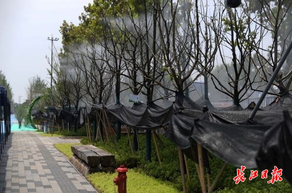位于武昌临江大道的武昌生态文化长廊工程,这里正在进行首开段的建设。记者看到,除了围挡每隔2米安装一个喷头外,这个工地最与众不同的是,树木上也安装了喷淋系统。