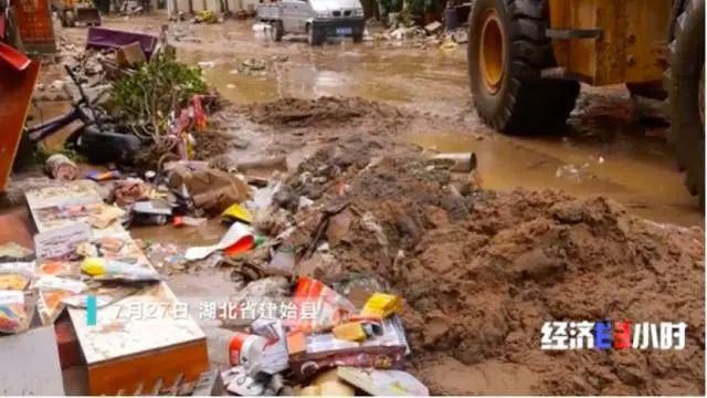 7月27日,洪灾后的建始县一片狼藉。洪水退去,留下的到处是积水、淤泥、垃圾。