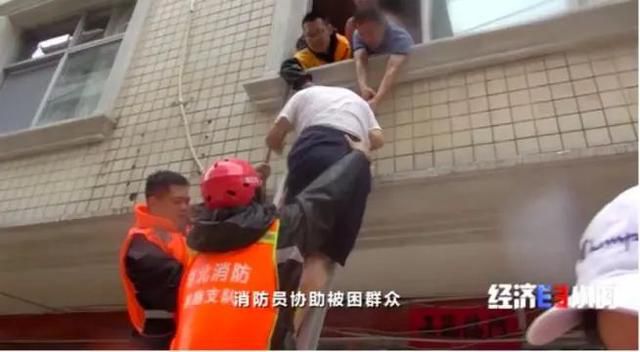 由于水流湍急,冲锋舟动力不足,很难靠近被困群众,情急之下,消防救援队员用携带的安全绳将冲锋舟固定在已经断电的电缆上,成功将搜救艇靠近楼房,一名队员负责固定好冲锋舟,其他两名队员在梯子旁一边负责固定,借助伸缩梯作业,很快,救援人员成功营救出了这里的5名被困群众。
