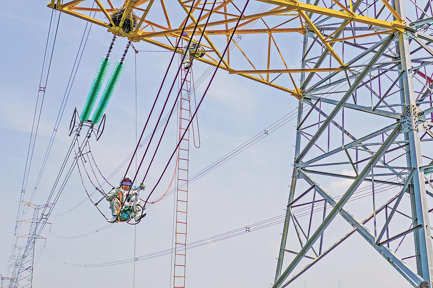 8月5日,国网湖北检修公司输电检修中心带电作业班的检修人员,在高温下进行高空带电作业,消除3个间隔棒缺陷。 (湖北日报全媒记者 梅涛 通讯员 于江 摄)