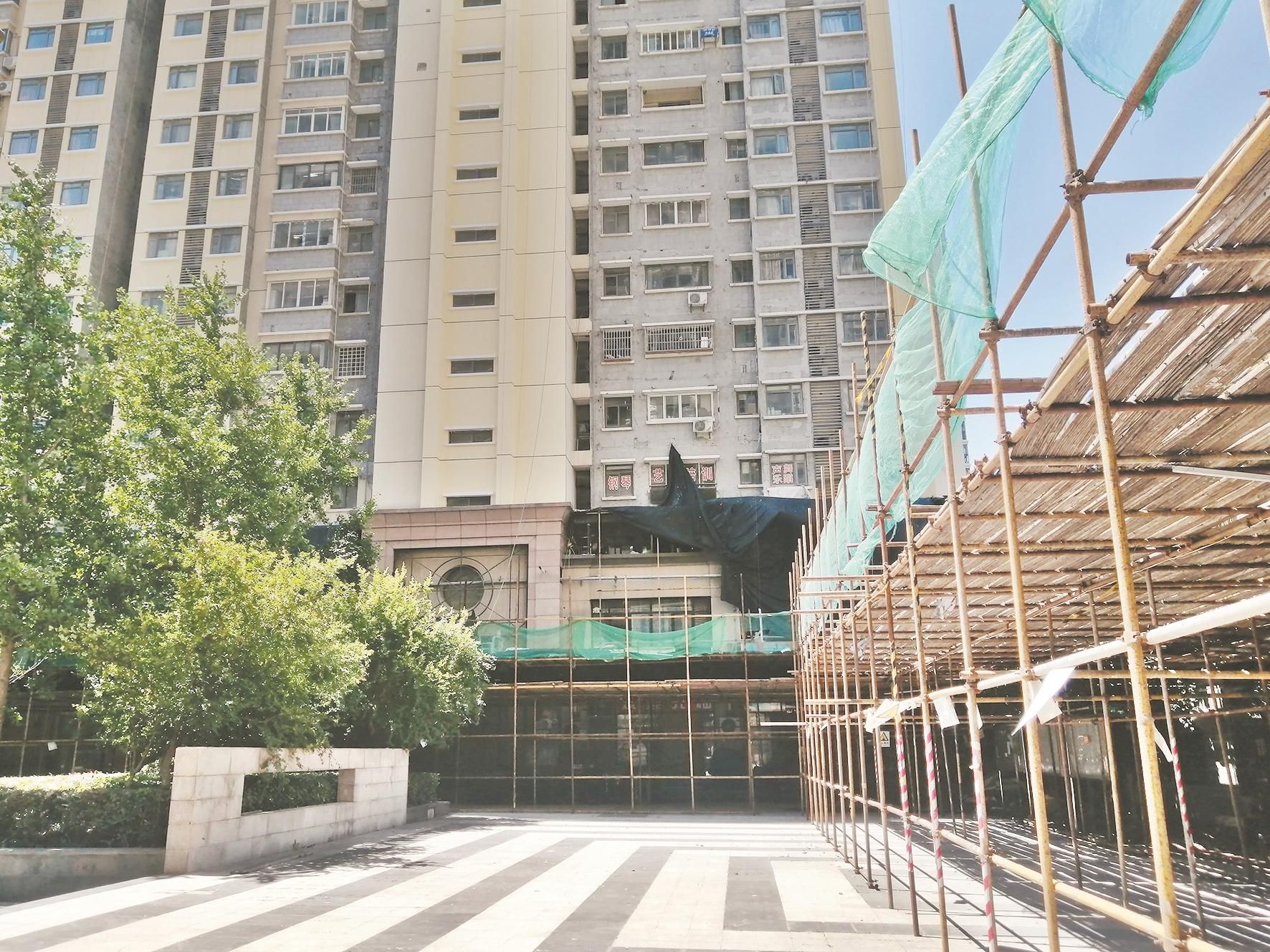 施工方介绍,因为开发商认为房屋已过质保期,不再负责维修,小区业主又不同意使用住宅专项维修资金,因此资金问题一直没有落实。当时只能搭建脚手架,防止高空坠物。直到今年4月,通过江岸区政府协调筹资,同安家园四期的外墙维修工程正式启动。