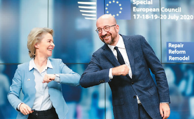 七月二十一日,欧盟峰会就七千五百亿欧元规模的“复苏基金”达成一致。图为欧盟委员会主席冯德莱恩(左)和欧洲理事会主席米歇尔在位于比利时布鲁塞尔的欧盟总部出席记者会时击肘致意。 新华社/美联 |