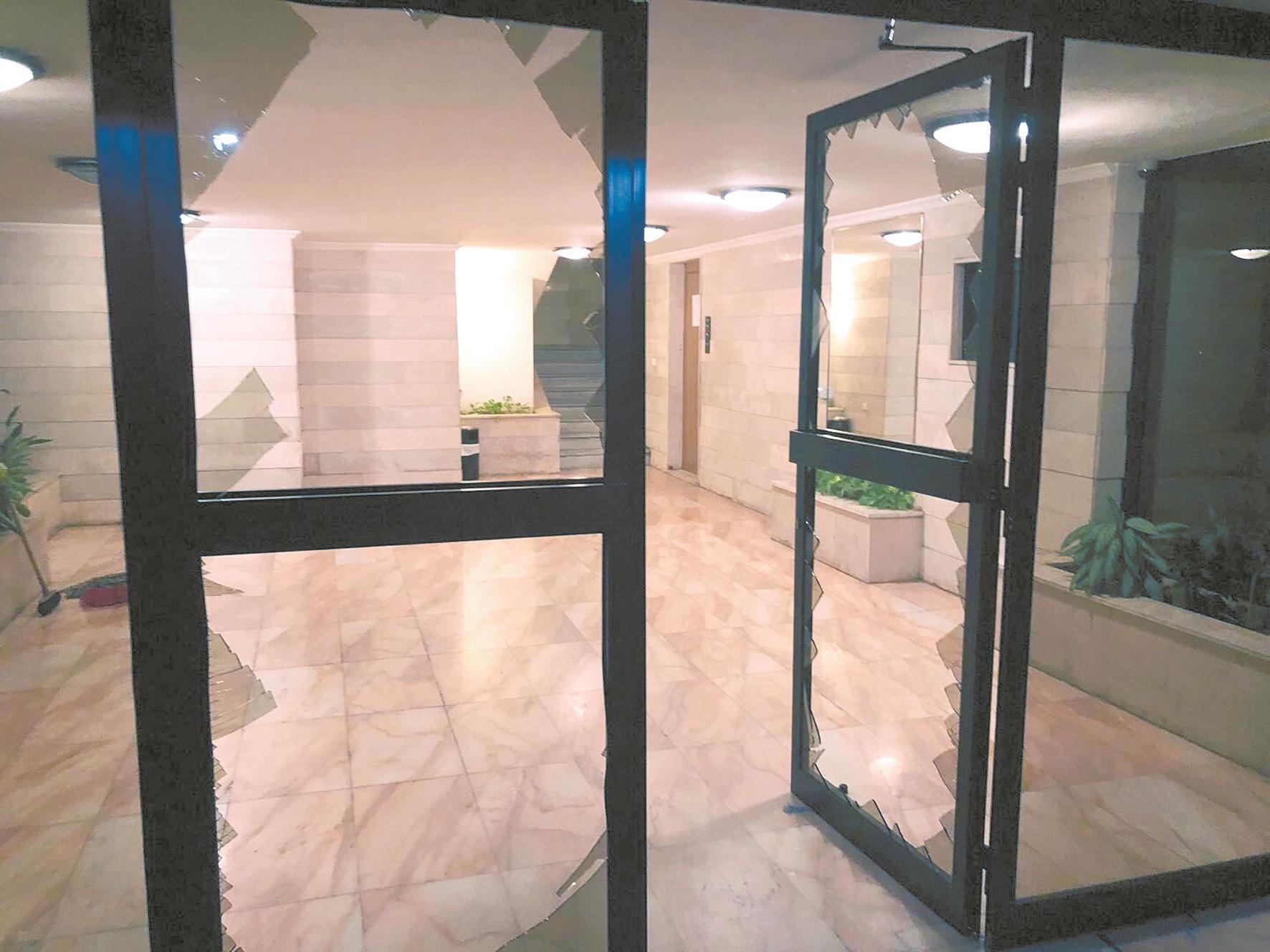 詹尉珍办公楼一楼大门的玻璃碎裂