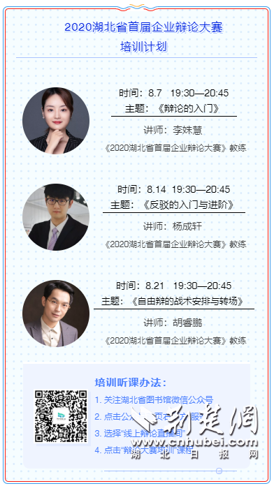 此外,8月14日和8月21日,讲师杨成轩、胡睿鹏还将分别为大家带来《反驳的入门与进阶》与《自由辩的战术安排与转场》两场线上培训课程,继续助力湖北职场人士开拓辩论思路,提高辩论技巧,凝聚企业发展合力。