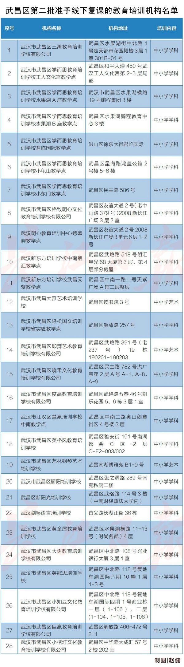 长江网8月6日讯(记者杨枫 通讯员王琼)按照《武汉市新冠肺炎疫情防控指挥部关于校外培训机构有序恢复线下培训工作的通知》要求,经机构自查自评、书面申请和武昌区新冠肺炎疫情防控指挥部组织评估认定,以下教育培训机构达到线下复课标准,准予线下复课。