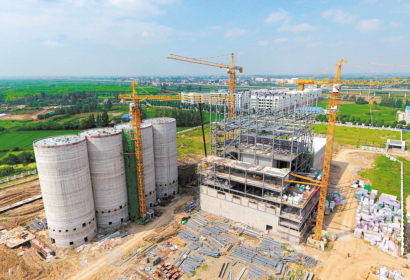 8月6日,襄阳正大百万吨饲料工业项目正在加紧建设中。该项目占地208亩,是正大300万头生猪全产业链配套项目,建成后可实现年产猪饲料100万吨。据了解,该项目配套有专业的环保设备和生物防控设施,是集环保、安全、智能化为一体的大型饲料加工工厂。(湖北日报全媒记者 田悦 通讯员 张雪飞 摄)