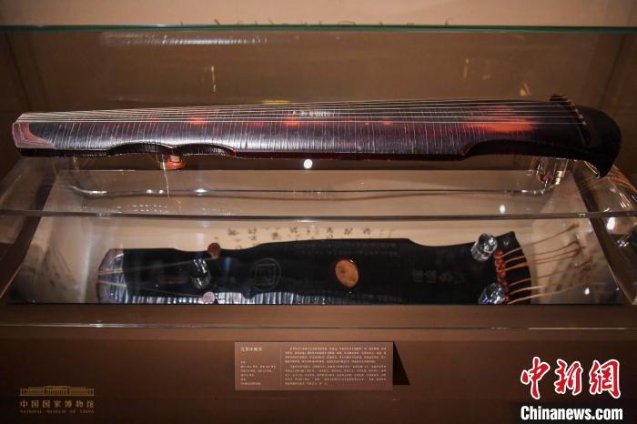 亮相此展的“九霄环佩琴”藏于中国国家博物馆,颇具盛名。这张斫于中唐的古琴距今千余年,原漆为黑色,露朱漆地。筒体发小蛇腹间牛毛断纹。琴为桐木所斫,做工圆润不露楞角。足池装红色玛瑙足1对,轸池装红色玛瑙轸1副。琴腹内有墨书题字,已模糊不清。底面肩上阴刻小篆书“九霄环佩”4字。