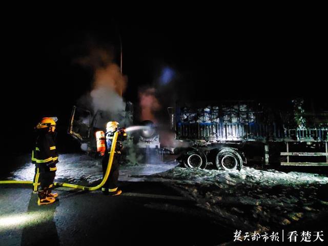 当日20时23分,消防救援人员到达后发现,事故现场火势燃烧猛烈,火焰有四五米高,半挂货车四周散发出刺激性气味。幸运的是,车上无人员被困。“车辆着火时,司机先下车用灭火器灭火,但没有效果。”救援人员告诉楚天都市报记者,挂车车头与货箱之间是个天然气储罐,是挂车的动力燃料,后半截装载的是整车氢氧化钠,燃气罐内的天然气仍在不断泄漏燃烧,发出嘶嘶声,车上装运的氢氧化钠若接触到水会发出大量的热量,情况十分危急。