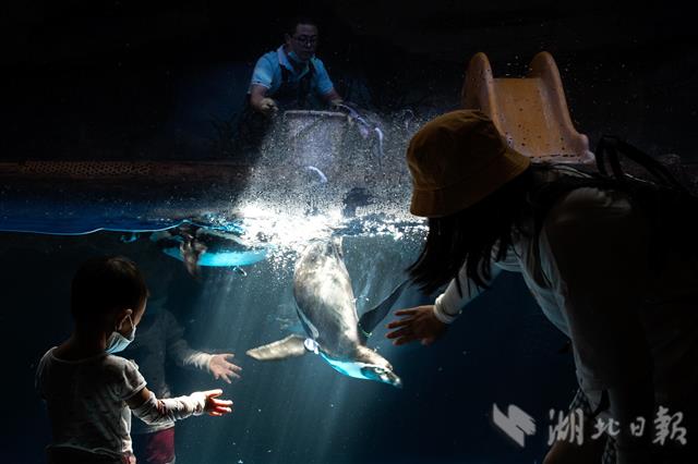 2020年8月7日,在武汉海昌极地海洋公园内,工作人员给企鹅投喂冻成冰糕的小鱼小虾。