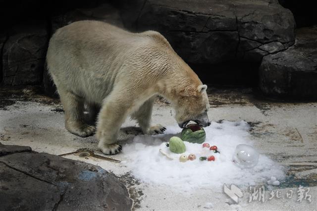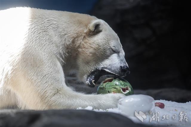 2020年8月7日,在武汉海昌极地海洋公园内,北极熊吃着冰镇西瓜、苹果消暑。