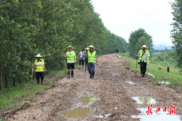 7月18日,防汛人员在泥泞的通顺河大堤上巡堤。李璨 摄