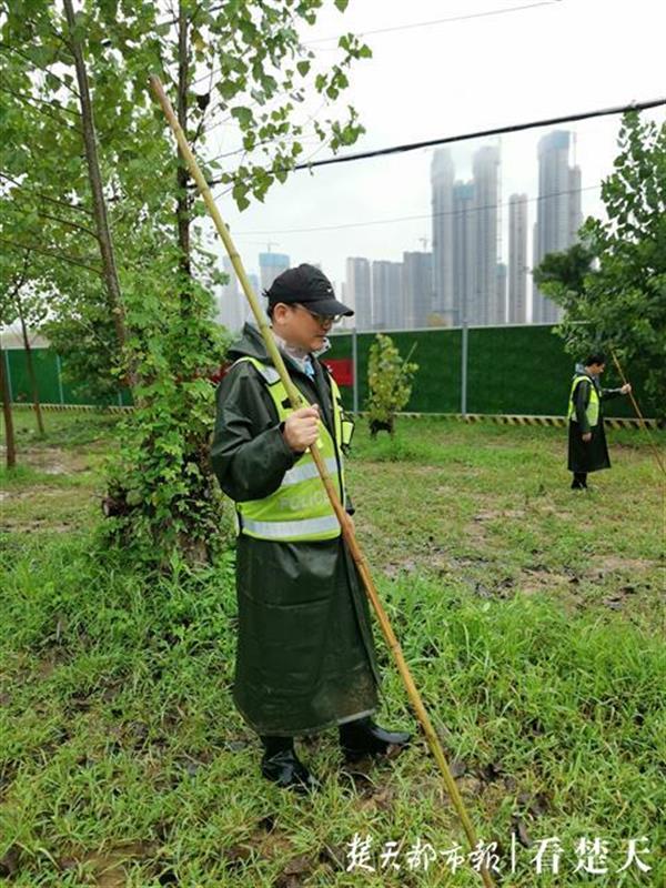 有人这样形容武金堤:“雨天一身泥,晴天一身灰,日夜不间断,蛇虫常相伴。”还有人说,路过这里必然被蚊子“惦记”。即便如此,57岁的文法学院钟涨宝教授仍坚守巡堤一线,大堤上留下了他和同事手持竹竿、细致巡堤的一幅幅画面。