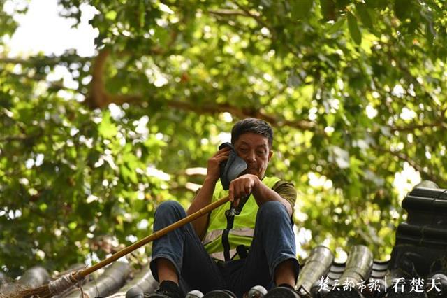 8月7日,记者在黄鹤楼公园看到,3名腰间系着安全绳的工人在清扫公园内附楼群房顶上的垃圾。据了解,为了保证屋顶干净整洁,公园环卫部门组织人员随时清理楼顶垃圾,还景区清洁。