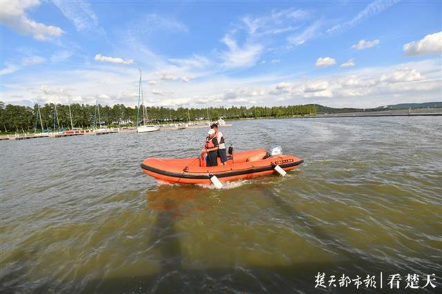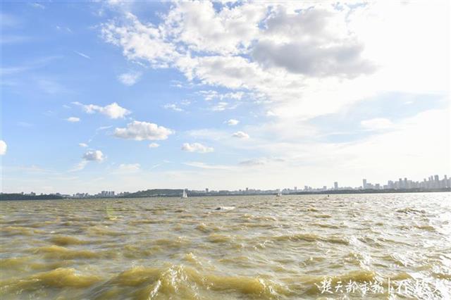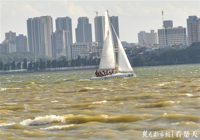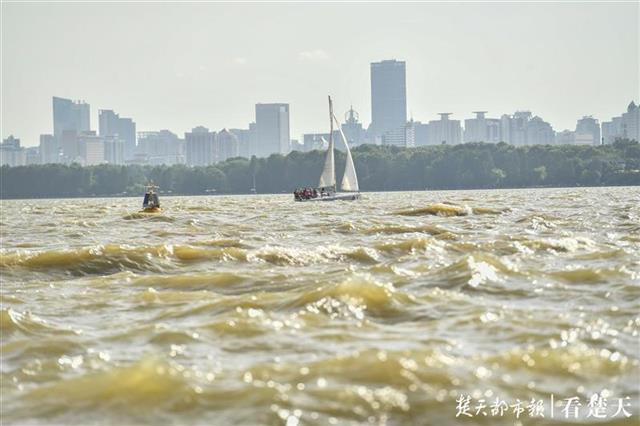 8月7日,武汉白天南风5-6级,受台风影响,往日平静的东湖水被风掀起阵阵浪潮。巨浪一波接着一波,拍打着湖岸。记者在东湖帆船基地看到,在滚滚浪潮中,几艘帆船踏浪前行。游客也纷纷以浪潮为背景自拍。