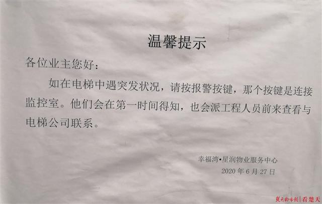 今日,楚天都市报记者在该小区1号楼2单元电梯内,看到一份小区物业今年6月底张贴的温馨提示,提醒业主如在电梯中遇突发状况,请按报警按键,物业会在第一时间得知消息,会立即派工作人员前来查看,并与电梯维保公司联系进行及时应对。