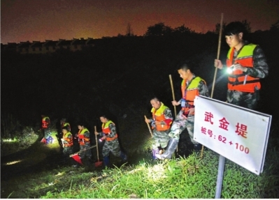 7月14日凌晨,武金堤防汛突击队员拉网式排查堤防背水面渗水、管涌、跌窝等险情。