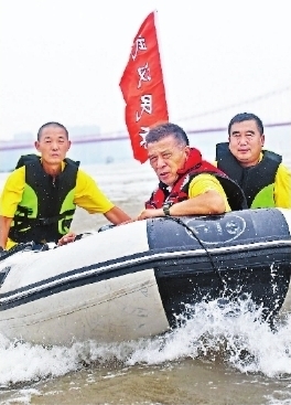 7月12日,武汉长江救援志愿队队长张建民(中)带队巡江值守,确保市民群众生命安全。