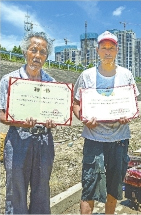 6日上午11时,62岁的刘建汉和64岁的李世华在江边冒着高温亲手送别了陪伴自己20多年的渔船,成为护鱼信息员。