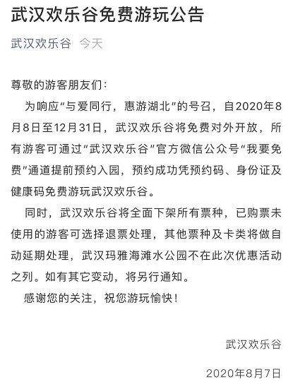 昨天下午,武汉欢乐谷通过微信公众号发布免费游玩公告。免费旅游政策实施当天,武汉欢乐谷将全面下架所有票种,已购票未使用的游客可选择退票处理,包括景区自有年卡在内的其他票种及卡类将做自动延期处理。