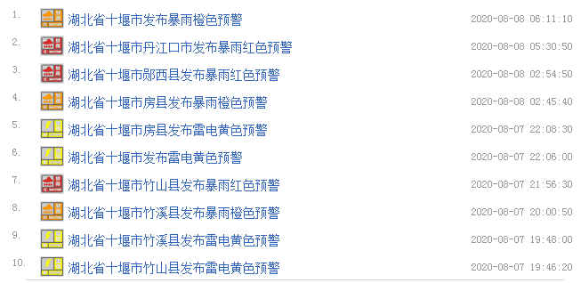 早上5:29和6:10,丹江口气象台和十堰市气象台又分别发布暴雨红色预警和暴雨橙色预警信号。