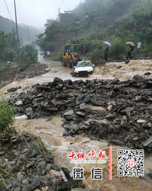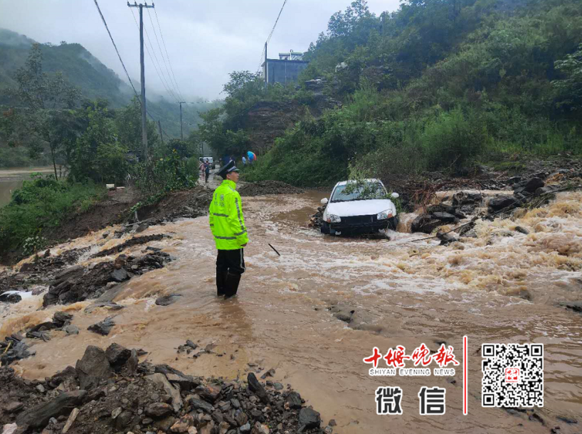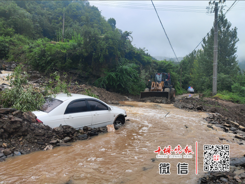 今早,在郧西县夹河关凉水沟,一辆轿车涉洪被困,挖掘机赶到现场疏通道路,民警雨中指挥。