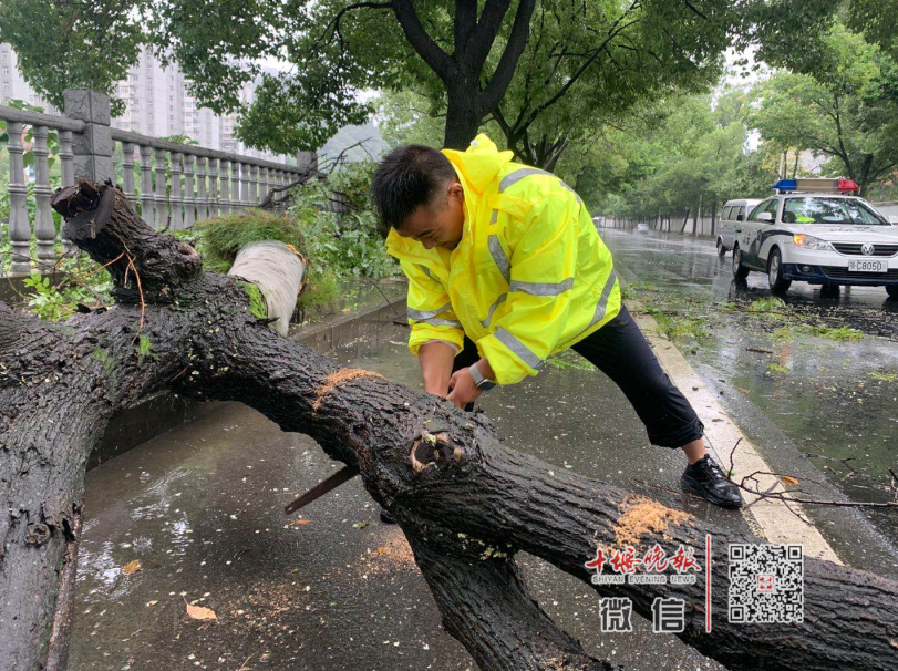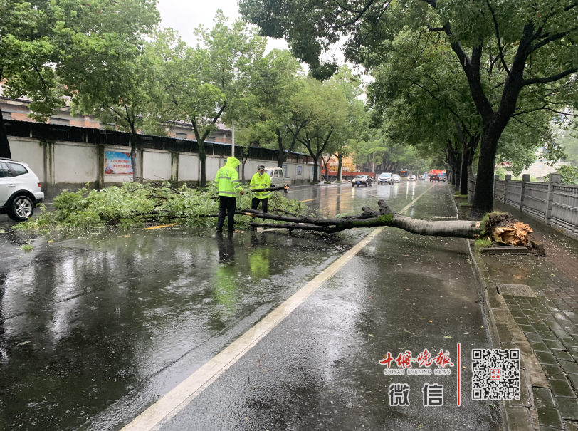 在茅箭区辽宁路,路边一棵大树倒在路中央影响车辆通行,一大队民辅警迅速赶到现场清理 ,保障道路通行正常。
