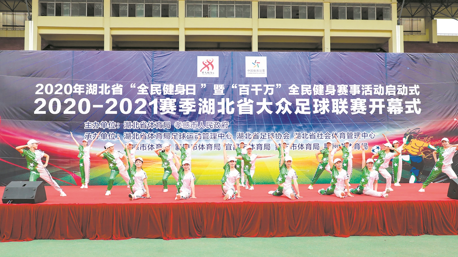 昨日上午,踏入孝感市体育中心,便可以看到手拍鼓、健身操、广场舞等多种项目精彩纷呈;体育场内朝气蓬勃,锣鼓喧天,齐刷刷的队形排列在足球场中央——由湖北省体育局和孝感市人民政府主办,以“崇尚人人体育 共创美好生活”为主题的2020年湖北省“全民健身日”暨“百千万”全民健身赛事活动启动式、2020-2021赛季湖北省大众足球联赛开幕式在这里拉开了帷幕。