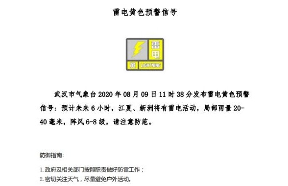 长江网8月9日讯(见习记者范佳昕)8月9日11时38分,武汉市气象台发布雷电黄色预警信号:预计未来6小时,江夏、新洲将有雷电活动,局部雨量20-40毫米,阵风6-8级,请注意防范。
